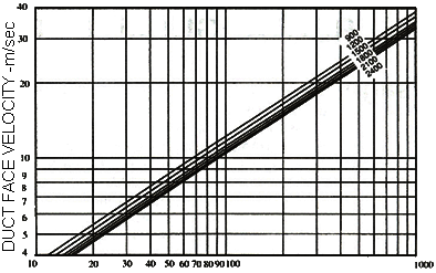 例如: 假設氣流量為5M/SEC最大可能的壓強損失為1OOpa,再假設長為1200mm的消聲器能達到隔聲要求。 右圖中, 水準軸上為100Pa , 消音器長為1200mm,可求得管道速度為11.6m/seC。給出管道面積為: