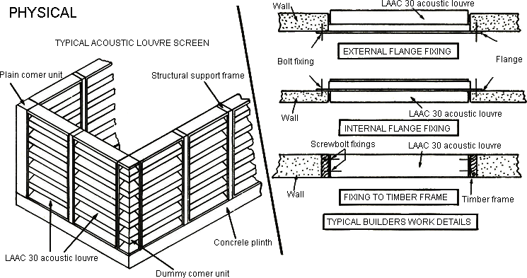 TYPICAL SPECIFICATIONS-(into builderswork opening)-NOISESTOP LAAC 30 Acoustic Louvre shall be installed in the position indicated on the drawings to maintain the acoustic criteria shown in the specification. The acoustic louvre shall be constructed from galvanised sheet steel and be supplied complete with internal mounting flanges and birdscreens fixed to the rear face of the louvres. -(as acoustic screen)-A screen of NOISESTOP LAAC 30 Acoustic Louvre shall be installed aroud the cooling rower to a height of 2400mm. The screen shall be mounted on a pre-formed concrete plinth 300mm high and 350mm wide and supplied complete with dummy corner units, structural supports and a dummy louvre access door. The louvres to form a self supporting structure and the external finish to be black plastic coated steel.