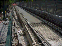 The solution consists of a rail that is completely encapsulated in an elastic jacket, CDM-JACKET, with a unique shape and adapted stiffness characteristics. The jackets are manufactured from resin-bonded rubber using granules that are made from 100% re-cycled tyres. The system, when installed in concrete and the road finish, provides support to all sides of the rail and allows stringent vertical and lateral support criteria to be met.